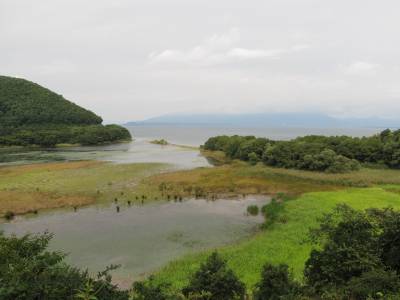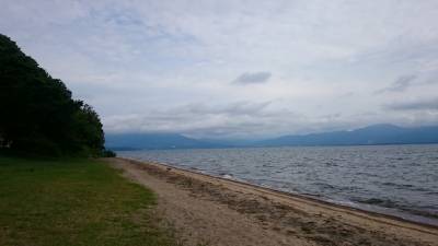 今まで見てきた湖とはひと味違った光景に息を呑む。天橋立のように、小さな砂州が湖からこちらを隔てていて、こちら側は浅瀬になっている。鬼沼というそうだ。山の深い緑と、鮮やかな黄緑と水の織りなすグラデーションが心地よい。ううん、湖を隔てた向こう側は雄大な磐梯山が見えるはずなのだが・・・・。