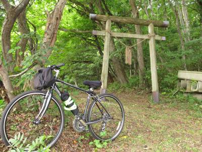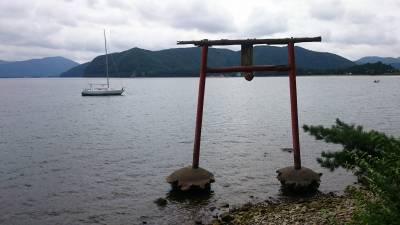 降りてきたところは、もう本当に湖すれすれに走る。きもちいい。磐梯山が見える・・・はずなのだけれど、麓から上はみんな雲に隠れてしまっている。この辺りはもう湖の南端にほど近い。と、水中から小さな鳥居が顔を出している。多分、船から参拝できるようにしてあるのだろう、鳥居の正面には「金比羅宮」と彫られた石碑が建っている。こんぴらさんは海上交通の神様。この辺の漁師さんが、漁の無事を祈って参拝するのだろうか。このような形式は、琵琶湖にある白鬚神社や、広島県の阿伏兎観音でも見たことがある。阿伏兎観音は岬にお堂が突き出ており、船から供物を流すと、お寺でそれを受け取っていたと聞いたことがある。いずれにせよ、わざわざ水辺に寺を建てたり、入り口の鳥居を建てたりするのは、水の民の信仰と結びついていて、陸中心の視点だけでは見誤ってしまうことも多いということだろう。