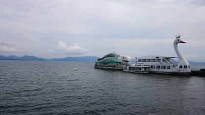 遊覧船を見ながら最後の休憩 はくちょう丸、かめ丸。そのまんまやがな、というのは置いといて。