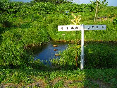 ここから歩くこと数分、いよいよ分水嶺です。分水嶺までは、きれいに舗道が整備されていて、せせらぎの音、秋の虫の鳴き声、日暮らしの合唱。ぐるりは草地でいろんな花が咲いています。特に宮城県の方面を眺めやると、ずうっと続く草の波が果てるところは山。すばらしい場所です。分水嶺は、流れ出した用水が左右に分かれるその場所です。なにげない用水ですが、東に流れた水は太平洋へ、西に流れた水は日本海へ、もはや出会うことはないのです。目の前でどんどん二手に分かれて流れ出て行く水をじっとみつめます。目の前で分かれるというのが感慨深いですね。山を越えると川の向きが逆になっているというのはよく経験しますけどね。