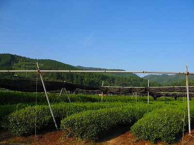 城陽で307号線を左折、東に向かい、宇治田原で府道62号を右折。これで山を越えると笠置です。さすがは宇治茶の産地、一面にお茶の畑ですね。山の斜面が全部茶畑になっていて、山に茶の畝の模様が横一直線の緑の帯として、いくえにも浮かび出てます。霜を防ぐための扇風機が茶畑に向かって設置され、強い日ざしを防ぐ黒いネットがひと所にひきよせて畳んであります。さすがは宇治茶、手間をかけて栽培されているんですね。