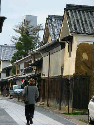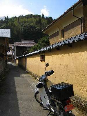まだ町が活気づく前の休日の朝。カブ君を停めて、町を歩きます。たしかにとてもすてきですよ。何がって、自然なままで町並みが保存できているから。かつて九州の杵築でも、そして、岡山の吹屋でも感じましたが、人の息遣いが聞こえてくるような町並み保存はとても好感がもてます。あとでまた書きますが、明治村のように、見るためだけの博物館という視点での保存は、「博物館」としては意味があるでしょうが、町としてはその機能を失ってしまう訳で、疑問が残るわけです。