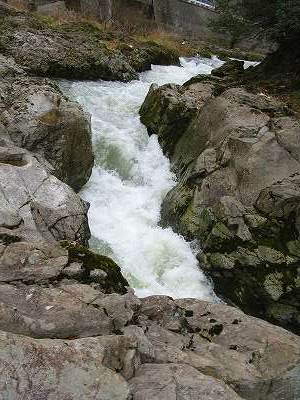 しばし立ち尽くしたあと、道にいざなわれて川沿いの遊歩道を流れに沿って下ってゆきます。え?何か変。階段が水中に没していきます。今朝がたまでの雨で水量が増えているんでしょうか、どうやら遊歩道は何カ所かで完全に水没してしまっているんですね。そのまま歩けばひざくらいまで水に浸かりそうだから、道なき土手を転ばぬようにそろそろ。川幅は急に広くなり、どうと音を立てて流れてゆきます。さっきとは全く違った表情の川です。