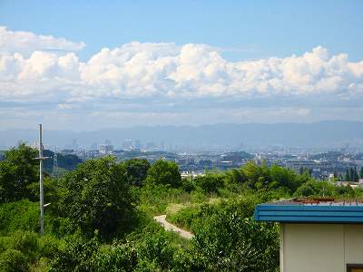 振り返ると、ずうっと向こうに大阪の高層ビル群が蜃気楼のように浮かび上がります。例のPLの塔もくっきり。大阪に残る唯一の村、千早赤阪村の入り口です。楠木正成の千早城で有名ですね。