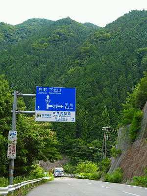 ここを過ぎて、もう熊野まで60キロあまり。だいぶ紀伊山地の奥地へと侵入してきました。で、さっき富田林からこちら方面を向いて走ってきた309号線に、逆側を向いて入ってゆきます。大峰山脈を西へ横断する形です。大型車は通れないという標識。いきなり道は細くなり、山の尾根伝いにくねくね上っていきます。何度もこんな感じの滝を見ました。