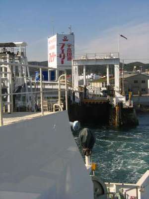 ここ宇野と高松ま間は「四国フェリー」、「宇高国道フェリー」の二つのフェリーが結んでいます。お互いライバル同士のようで、値段は同じ、大体40分間隔で、頻繁に運行しています。ここは、せっかくですから、海の国道「国道フェリー」を使うことにしましょう。国道30号線は、ちゃんと宇野で国道フェリーの乗り場まで来て、高松では、フェリーを降りたところから始まっているんですよ。cub君と私で1500円弱。チケットを買って、乗込むやいなやぐぉーっと大きな音を立てて扉が閉まり、客室にあがる時にはもう出港してしまっていました。
