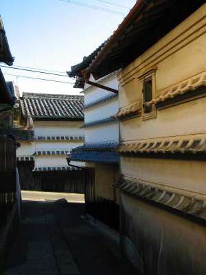 壁の途中に、いくえにもしつらえられた、小さな瓦の列が、斜めから吹きつける雨風を防ぐという仕掛けです。見た目にも、ひらひら続く水切瓦は、白いしっくい壁のアクセントになっていて美しいものです。