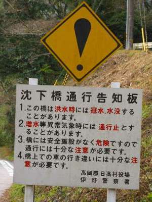 「いの」で松山方面へいくR33と別れます。急に山の中へ。とても広い仁淀川を左に見ながら、ここも快走。と、四国の写真ではよく見かける、沈下橋が見えてきます。ここは渡ってみるべきでしょう。水量が増えると沈んでしまうので、欄干がありません。車はすれ違えないくらいの狭さ。土手の高さを走る国道から急坂で橋のたもとに下ると、ちょっと怖い。橋のそれこそ真ん中をいきます。ここはダンプも通れるくらいの広さだけれど、もっと狭いのもあるらしい。あまり渡りたいとは思わないけれど。