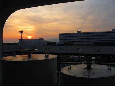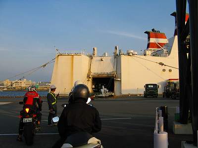 気持ちのゆとりができて市内中心部を通り、R10へ。しかし、距離感がつかめなくて、なんども道を間違えてしまいます。フェリーの発着する新門司へ行くためには、途中でR10から県道へでないといけないんですが、どうやら一部区間はR10と並行して走っているらしく、なんどか県道の番号にしたがってそちらへいってしまうと、全く逆方向だったということ。だんだん出航の時刻は迫ってきます。あとほんの少し。こんどは、時間がえらく早く過ぎていきます。フェリーターミナルに滑りこんだのが、出航10分前。乗船券を買って、cub君を連れ込むやいなや、乗船口の巨大なドアがうおおおんといううなり声をあげて閉まり、ほどなく出航。いやはやぎりぎりの綱渡りでした。もし、ガソリンを入れに日田市内まで戻っていたら、汽笛を鳴らして出航して行くフェリーを見送ることになったでしょう。