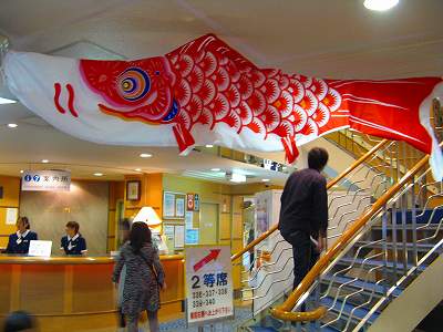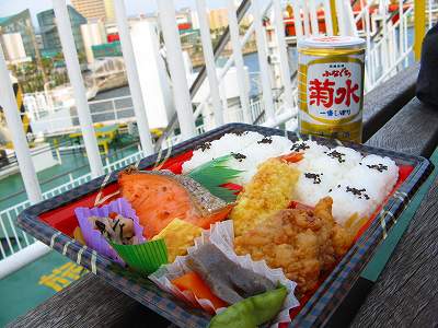 船内は真っすぐに歩けないほど、あっちこっちから人が出てきて、ゆっくりできそうにありません。こうなれば、外に出るしかなさそうです。目の前には大阪府庁が移転するとかしないとかで話題になっている、WTCの超高層ビル。少々寒いのを我慢して、夕暮れの大阪南港を眺めながら、夕食としましょう。ぽつり、ぽつりとごはんを口へ運んでいる間に、目の前のビルが、夕暮れ色に染まっていきます。何十と泳いでいる鯉のぼりの下、埠頭近くで鬼ごっこしていた子供たちもいなくなってしまいました。