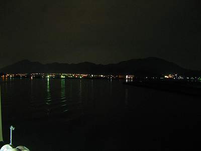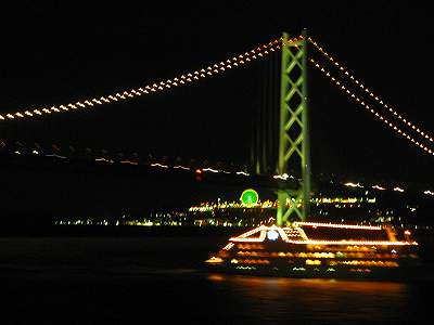 ほろ酔い気分で暑くなってきたので、甲板に出てみます。ちょうど明石海峡大橋の下を通るところでした。甲板には、今までに見たこともないような多くの人々が集まって、みるみる大きくなってくる橋げたのイルミネーションにざわざわ声を上げています。丁度橋の下に入った瞬間、わあっと一際高い歓声。なんだか、年が明けた瞬間みたいな盛り上がりようでした。そんな楽しそうな声を聞いていると、心は穏やかに満たされてきます。
