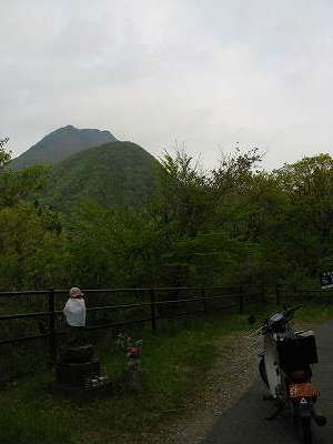 この正面に見えている外輪山を越えて、日田、行橋、北九州門司と北上を続けます。まず、温泉で有名な内牧から、外輪山をぐいぐい上って、その一番高くなったところが「大観峰」。徳富蘇峰が明治のころにやって来て名付けたという、360度のパノラマが楽しめるらしい。天気がどんどんくずれて来ていますが、大駐車場には大勢の観光客の車、車、車。バイクもひしめいています。