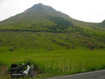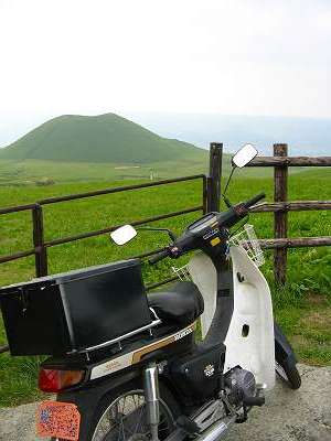 いやあ何度走ってもごきげんな道。頭の中のもやもやがすううっと引いていくようなすてきな感覚。右に左にカーブをクリアしながら、牛がのんびり草を食む緑の草原、あるいはその向こうに広がる田園地帯、そしてその向こうに壁のように立ちはだかる外輪山などを目に写しつつ、しだいに、さっきは俯瞰していた田園のなかに自分が溶け込んでいきます。