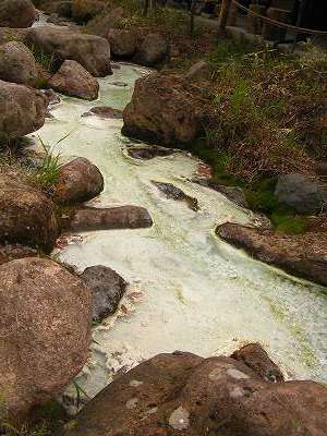 おっとその前にぜひ寄らなくちゃいけないところが。それは、「寒の地獄温泉」。ちょうど船を降りて2時間。9時からだと地図には書いてあるので、少し待ちます。で、9時を過ぎてもまだ「日帰り終わりました」の看板が出たまま。
