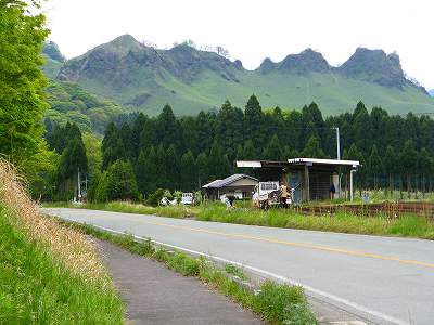 ちょうど寒の地獄温泉は久重連山を過ぎたところで、ひと山越えると、見渡す限りの草原の中を走ります。はるかの向こうには阿蘇がちょぼっと並んで見えています。