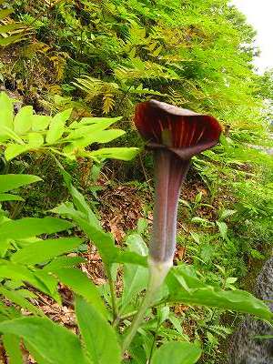 道の際にはこんな花が咲いていて。遠くに来たと感じさせて暮れますよ。テンナンショウの仲間でしょうか。名前が分かりません。