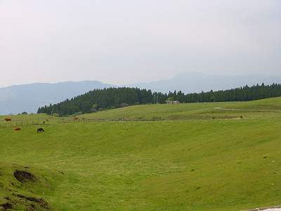 で、いよいよ阿蘇へ上っていきます。ぐんぐん高度を上げ、いやあいいですねえ。はるかに続く草原には牛が放牧されて、胸がぱあっとすく思いです。