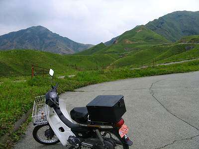 高森までの道はワインディングあり坂あり。巨大な苔玉のような山や丘をぐいぐい昇って降りたところが高森。ここから針路を西へ、R218で。市街地を外れるとすぐに急な上り坂。高森峠です。パーキングにcub君を停めて振り返ると、今走ってきた高森が一望できます。今日はこんな胸のすくような風景を何度も見ることになります。