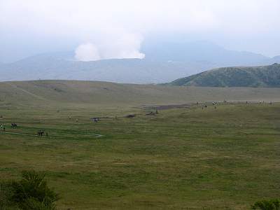 山頂を目指す車は、昨年同様じゅずつなぎ。もちろん遠慮します。で、草千里、米塚などを見ながら今日のハイライトを楽しみます。草千里の向こう側には、火口が噴気をあげているのが見えます。