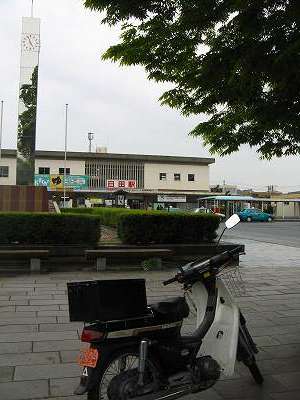 で、気持ちのいいファームロードを抜けて、日田市。駅前の大きな木の下を借りてほんの少し休憩。