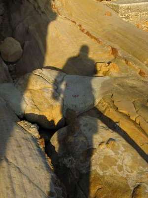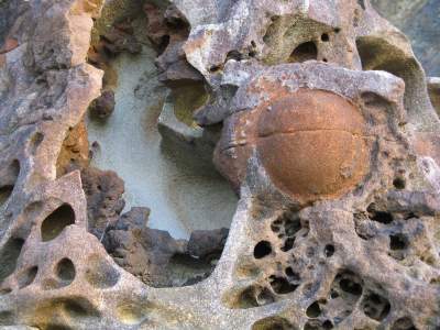 足摺岬の次は楽しみにしていた、「見残し海岸」。なんでも、かの弘法大師をして「見残した」と思わせたという不思議な海岸らしい。ここは、ぜひみておきたかったんです。が・・・あれれれ?竜串海岸という標識が見えてきましたよ。いつの間にか入り口を過ぎてしまっていたみたい。ええっ、と思いましたが、時間にも余裕がなくなってきてるし、竜串を見ることにします。折からの強風で、細い遊歩道から振り落とされそうになりながらゆっくり海の方へ進んでいくと、視界が開け、なんとも形容しがたい、不思議な形の岩があちこちに、というより周りの岩が全部不思議な形をしています。ぼつぼつと蜂の巣のように穴が空いたもの、色んな色の入った飴をびよーんと延ばしたようなもの、巨大なナメクジのようなもの、つるんとした岩から、指先がいっぱい出ているように見えるもの、侵食の関係でこうなったんでしょうが、まったくすごいとしかいいようがない。それだけで、前衛芸術になりそうなのもごろごろしています。