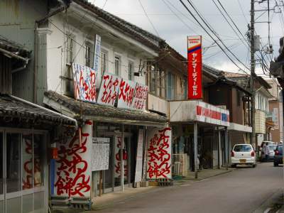で、国道と岩松川をはさんで細長く広がる街を歩くことに。川沿いに一本、山側に一本、と二本の道の両側に家が広がっています。山側の道がにぎやかで、商店や旅館がびっしり並んでいます。正月の準備なのか、人どおりも多いし、車もひっきりなしに通ります。でも、この道の両側に並んだ風景はいいですよ。まるで昔のままの店や旅館がそのまま並んでいて、しかも活気があるのがいい。昨日の土佐久礼とはまた違った雰囲気があります。あっちのほうが、漁師の街っていうかんじかな。でも、岩松も港で栄えたはずなんだが、むにゃむにゃ。都合が悪くなるとごまかします(笑)。