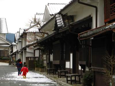 次に止まったのは、ここも見たいと思っていた街、宇和町です。合併で西予市となってますね。この町も、やはり古い町並みが残っていて、観光ガイドにも載っています。歩くのはしんどいので、cub君でぐるぐる街を回ってみましょう。国道から外れて細い道をのんびり流していると・・・あるある、こっちは江戸時代の家が、そのまま並んでいる場所が何百メートルかにわたって残っています。ここは観光名所なのですが、観光施設はすべて閉まっているため、訪れる酔狂な観光客はうまさんと、あと数グループだけ。これは、歩くしかないでしょう。cub君をほとんど車の止まっていない駐車場に置き去りにし、カメラおじさんと化するうまさん。通りはひっそりと静まり返っていて、時折屋根に積もった雪がばさーんと落ちてくる音だけが響きます。通りの端まで言って戻ってくると、女の子が二人、雪で遊んでいます。と、急に小さい子が泣き叫び出す。通りすがりにちらと見てみると、どうやら姉が妹の首から雪をいっぱい入れたらしい。うまさんがちらりと一瞥をくれると、姉は焦って、こっちに聞こえるように「冷たいの、我慢しなさい。」と言いながら必死で自分が入れた雪をかきだします。その焦りようがおかしいのなんの。妹は可哀想なんだけど。