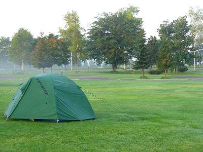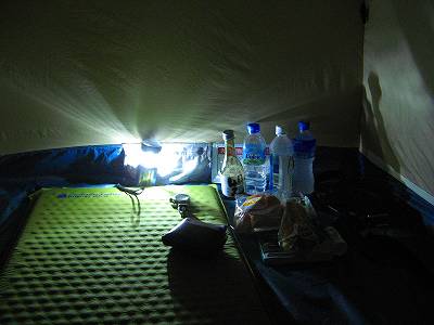 ホームセンターで数百円で売っているブルーシートを持っておくと重宝する。(100円ショップのやつはちょっと薄すぎるのでお薦めしない)防水じゃないバッグはこれで覆っておくと雨にあっても平気。現地に着くと、このブルーシートを敷いた上にテントを設営する。いわゆるグランドシートの役目。地面の湿りが伝わってきにくくなるし、もし雨になっても下からの水をずいぶん防ぐことができる。ただテントの床面より広く敷いてしまうと、シートに降った雨がテントの床下に入り込んで、わざわざ床下浸水させることになってしまうので、テントの床よりも小さな範囲に敷くようにするのがコツ。また、テントの床は、もちろん防水仕様だが、湿気だけはどうしようもない。シュラフがなんだか湿っぽい、床においてあった鞄や脱いだ服が湿っぽい、なんていうのは普通だ。この数百円の投資のおかげで、少しは湿気から解放されることになる。 | ![]() ![]() |