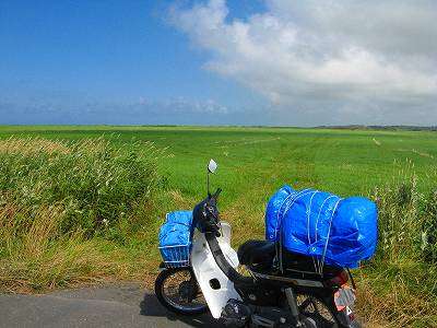 もちろんこれがなけりゃ始まらない。達人の中には、シュラフやシュラフカバー(寝袋ごと入れる大きさのカバー。)だけで野宿する人もいるようだが、臆病者の私はこれがないと。あ、テントは一人旅でも二人用がいい。一人用っていうと、一人寝たらそれだけでいっぱいいっぱい。荷物を置くスペースも考えると二人用が妥当だろう。自転車の人はかさばらない一人用を使っているケースが多いようだ。私のはネットで評判がよかったダンロップの製品だ。前室も付いていて、靴や椅子などを雨に濡れないように収納できる。バイクから降ろしたでかい鞄も中に入れることができる広さで満足。二万円ちょっとだったような。三つ下の段にあるブルーシートの写真、ちょうどカブの前籠に収まっているのがこのテントだ。畳むとこれくらいの大きさ。 | ![]() |