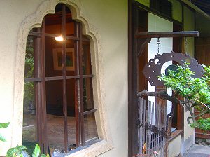 それで、二条城からほど近い所にあったこの家(小川家)が陣屋として機能するようになったということ。大名が泊まった場所だけにいろいろな工夫がなされていて、案内の方にしたがって邸内を巡り、いろんな仕掛けが開陳されるたびに、見学者たちからほおっとため息が漏れます。大名が泊まる部屋の天井は一カ所だけ開くようになっていて、有事の際には上に控えていた侍たちがそこを伝ってわらわらと降ってくると同時に、大事な大名はそこから二階へ逃げられる。また、二階へは隠し階段がしつらえてあって、大名がのぼって階段を引き上げると、そこは何の変哲もない天井に変わってしまう。あるいは、明かり取りの窓と見えたものが、実は上に逃げるためのトンネルの役目をしている。などなど、危険と隣り合わせだった昔の殿様の生活がしのばれます。先程の部屋に戻りますが、天井の穴が開いている時の客は油断ならない客で閉じている時の客はくつろいでもいい客なんだそうです。我々が訪問した時はしっかり開いておりましたよ。