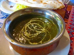 まずは自分のカシミールカレーを一さじ。一瞬の甘さの後クワーッっと口の中に辛さが広がり、辛さ5の面目躍如といったところ。ほんのりとした甘さとすっきりした超辛がうまく解け合って、ぐんぐんいけます。大きいナンをちぎってはつけ、ちぎってはつけ、もうとまりません。たしかにものすごく辛いのですが、後にひかない、すっきりした、としかいいようのない辛さです。なかには、ジャガイモがごろり、ぶつ切りのチキンがごろんと転がっています。同居人の頼んだパラクパニールもひ少し分けてもらいましたが、これも深くて味わい深いとてもすばらしい味です。