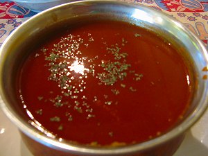 いろいろなカレーがありますが、私は、カシミールカレー(なんだか一番辛いやつみたい)、同居人はパラク・パニール(ホウレン草のカレー、インド風チーズ入り)。カシミールカレーは一番辛いらしく、「辛さ5ですがいいですかぁ?」と、インド人(らしき)ウエイター氏に念を押されます。先週の、「ベンガル湾」での恐怖が脳裏をかすめますが、激辛好きの私としては、ここで負けてはならじとばかりに、力強く首を縦にふります。ちょいと奮発、300円プラスして、ナン、サラダ、チャイがついたセットにします。