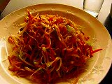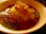ここでのお気に入りは、鶏ねぎ中華そば、あんかけ焼きそばの定食(昼のみ限定30食)、サラダ入辛冷麺、あと卵白のあんかけチャーハンというのもあります。それからそれから・・・。いろいろあって悩みますが、今日はサラダ入辛冷麺を頼みましょう。この冷麺は、普通の中華冷麺と違って、全然酸っぱくないんです。レタスやプチトマトの彩りの上に肉そぼろ、それに干しエビなどがはいったあっさりめのたれがかかります。トウガラシの辛さがぴりりとひろがって、清涼感あふれるたれが麺にからまり、それはそれはおいしいんですよ。同居人は、黒ゴマ冷麺。これも、ゴマの風味豊かな甘めのたれが、すばらしい。サラダの冷麺と麺の色が違います。