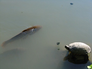 庭の池にいた、沈思黙考亀。鯉が寄ってきても微動だにしません。