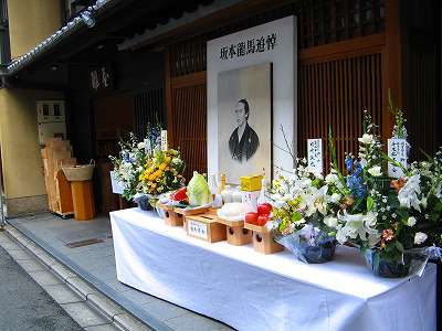 坂本龍馬が寄寓していた、酢屋。当時からずっと材木を商っています。命日の11月15日に近かったせいでしょうか、追悼の法要が行われていたようです。たしか、今年2007年は没後140年のはず。実際に龍馬が刺客によって最期を遂げたのは、この道を何百メートルか西へ進んで、河原町通を渡ったところです。