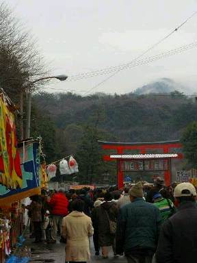 ふだんは人通りも少ない参道を埋め尽くす人、人、人。一方通行で両側に露店がひしめき合います。