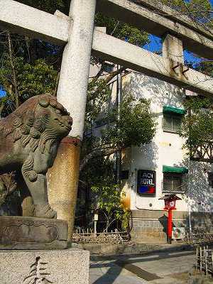 そして、縁結びの 神社。鳥居の奥にホテルの怪しいネオン。縁結びですなあ(笑)