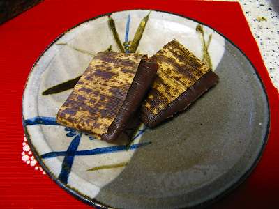 丁稚羊羹。湯を注ぐとあつあつのしるこ。どとらも上品な甘さ。丁稚羊羹には竹の皮の香りがほんのりと。