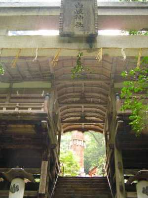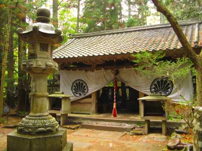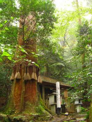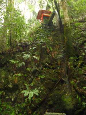 本殿の横からずうっと細い階段が続きます。奥の院への入り口。また急な階段に、しぶる同居人を半ば脅迫して(笑)登っていきます。階段がいつの間にか山道に変わり、軽い登山のような雰囲気。雨さえ降っていなければもっと歩きやすいようなもんですが、まあそれはそれ、仕方がありません。しかし、雨の効用というのもまたありまして、空気が濃い。ううんと胸一杯に空気を吸い込めば、木の匂い土の匂いが混じった、なんとも言えない爽快な香りが体を満たしてくれます。何度となく深呼吸を繰り返しましたよ。