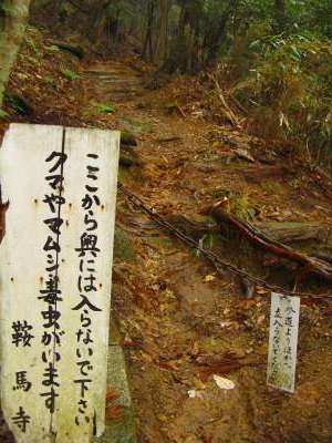 まさにこのあたりで牛若丸は兵法の訓練をしたといいます。うっそうとした山の中。齢を重ねた杉の木が何本も天をめがけて立ってます。自然、心が静まってきます。脇に建つ小さなお堂。義経堂。義経が奥州で亡くなった後、ここへ「遮那王」となって戻ってきたという信仰があるようでその「遮那王」を祀ってあるらしい。また、このあたりには、下の写真のような札が何カ所かに掲げられていて、いったいどんな修行をするんだと思わされます。修行で身を亡す人がいるということですよ。