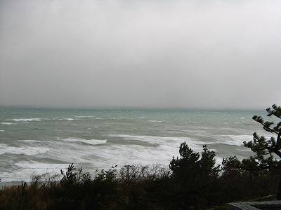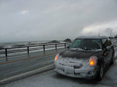 いやはや国道47号線はものすごいことになっています。雪もひどい。そんななかそろそろ西へ。遅い夜明けのころ、ちょうど日本海側鶴岡通過。しかし・・・やれやれ通勤ラッシュに巻き込まれてしまいます。でも、ここを過ぎると荒れ狂っている日本海の景色を少しは楽しむ余裕もできてきて。現在のところ日本海東北道の北の端、神林岩船港インターチェンジに昼ごろ。ここからは約六時間。除雪で通りやすくなった高速をひた走り、楽しかった雪道ドライビングも終了です。