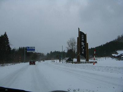 この道今回で四回目。これから標高をあげて峠を抜けると山形県小国町。去年、 肘折温泉からの帰りに通ったんでした。夏はさわやかな山岳道路。まだ雨ですが、思ったとおり標高が上がるに連れてどんどん風景が変わり、あっというまに真っ白の世界。道路も真っ白の雪がぎゅうぎゅうに押し固められた状態。いわゆる圧雪路に。