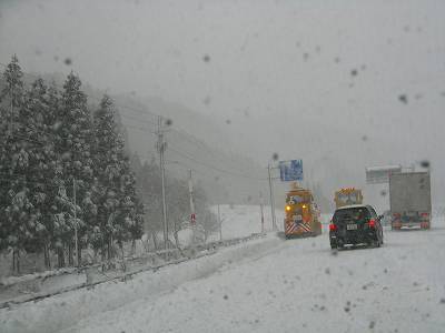 夜の名神高速をひた走り北陸道へ。雪が降り始めます。滋賀県から福井県に入るためには滑り止めが必要。車はみんなサービスエリアにいざなわれ、強力なライトを浴びて一台一台タイヤチェック。係員が厳しい目を注いでます。こんな経験は初めて。合格して本線へ。先頭を巨大な除雪車が二台、その後をのろのろと続く車列。除雪し終わった道上もみるみる白くなっていきます。久しぶりの雪道で少し緊張。