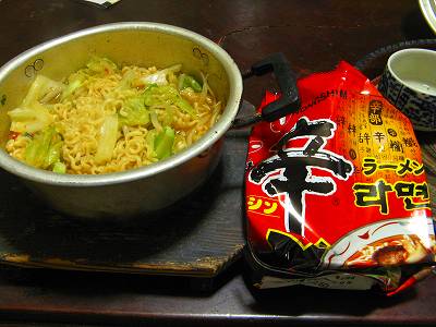 吹雪の峠を越えるとやっと人家が増えてきて、ほっとします。でももう楽しむなんて余裕なし。スーパーマーケットでラーメンと野菜を買い込み、国道沿いの宿へ。角を一すじ間違って隣の家の庭にぐんぐん乗り入れてしまうという失敗付き。係の人が妙に目をまるくしていると思ったら、旅館ではなく隣の住人氏でした。おまけにそのおうちへのアプローチは急坂。登るのにものすごく苦労しました。あげくのはてに、その家のご主人に押してもらったり。まことに申し訳ない。