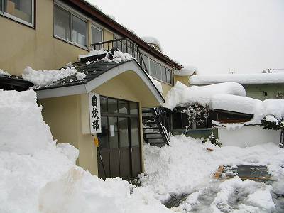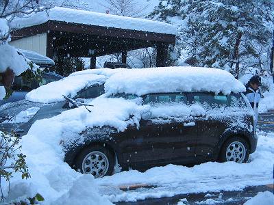 このように二日が過ぎていきました。あっという間。あと一日位滞在をのばそうかとも思ったほど。でも、どうやらまた年末に向かって寒気がやってきているらしいし、来るときのしんどさはもうこりごり。そういえば、静まりかえった廊下で外をぼんやり見ていると、ぐっぐっという低い音が聞こえてきて、どうやらそれは窓の半分位を隠して積もっている雪のなかから聞こえてくるらしい。上からの重みで押しつぶされていく雪の声。その陰鬱な声を聞いていると、もう帰らなくちゃという気持ちにさせられました。宿の人によると、この辺はもちろん雪が積もるんだけれど、一日でこんなに積もったのは珍しいらしい。24日まではほとんど積もっていなかったんだそう。