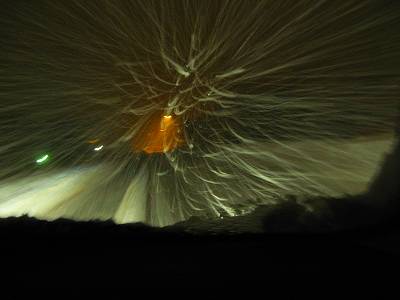 いつの間にか除雪車が道の外に消え去って、だんだんスピードが上がります。福井市のあたりからものすごい吹雪。雪は真上から降ってくるもの・・・だと思っていた常識があっという間に消し飛びます。闇夜を照らすライトに浮かび上がるのはこちらに向かってくる大きな渦巻き。車を一のみにしてしまうような巨大な渦巻きが延々と続きます。そして困ったことにぐるぐるカーブを描きながら向かってくる大きな白い粒子しか見えない。ああ恐ろしい。すでに深夜、さっきまで数珠つなぎだった車はいつの間やら姿を消して闇の中に白く浮かび上がる道をMINI一台。ときおり猛スピードでトラックが横を駆け抜けていきます。半分凍っている道、車線を少しでもずれると、畝のように高く積もった雪の衝撃がががががと。車線変更をするとそんな畝を削りながら、ずるずる滑るような心許ない感覚がハンドル通じて。