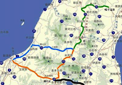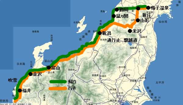 早朝4時起床。みんな寝静まっています。ごそごそ荷物をうごかしている私の音を聞いて、あのおばあさんが、寝ぼけ声で「だれ」と聞いています。動きを止めると、暗がりの中に静まり返る宿。起こして悪いねと思いつつ車に荷物を積み込み、準備完了。時折トラックが通る国道を西へ。予定では新庄からそのまま西へ向かい、芭蕉もくだった最上川に沿って日本海を見、そこ、鶴岡からあとは海に沿って京都までずっと南下。新潟からは高速があります。