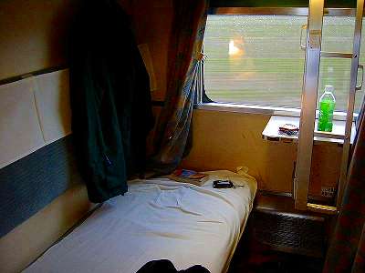 久しぶりのB寝台。記憶よりずっと狭いです。前の人とお互いに気を使って中に篭もりっきりだったので、窮屈でしようがありません。外を見ようにも窓の覆いは全部降りているし、とにかく寝台の中で酒を飲んで寝ることにします。ちょっとわびしい。