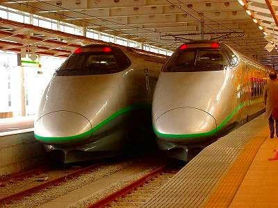 で、新庄駅。不思議な駅です。福島から北を目指してやってきた奥羽本線が、駅の真ん中で分断されているんです。ここから南は新幹線が通れるよう線路の幅を広くしてあるからなんです。真ん中に立って、北側をみると秋田方面の各駅停車が、南を見ると、山形新幹線が停まっています。