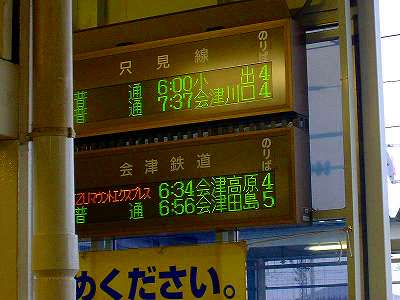 早朝発の列車に乗ります。 今日は、只見線という人気のローカル線乗車。この線も、廃止がうわさされながら、豪雪地帯を行くので細々と生き残っています。景色がよいのと、なかなか乗るチャンスがないので有名。ここ会津若松から終点、新潟県の小出まで行けるのは一日3本だけです。朝6時を逃すと、こんどは昼過ぎまでありません。で、眠い目をこすりながら、駅へ向かいます。